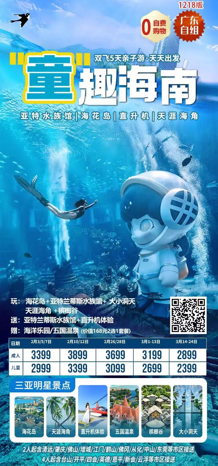 ★住宿安排:全程旅游度假酒店,升级一晚海花岛欧堡酒店★游玩安排: 海花岛:汇聚数百位国内外建筑大师,斥资千亿重构世界文化旅游版图。亚特兰蒂斯失落的空间水族馆:漫步于水族馆,探寻在海底隐藏了千年的亚特兰蒂斯文明,观赏奇幻海底 西岛: 全称西瑁洲岛,坐落在中国唯一的热带滨海城市三亚市三亚湾海域,是海南第二大岛