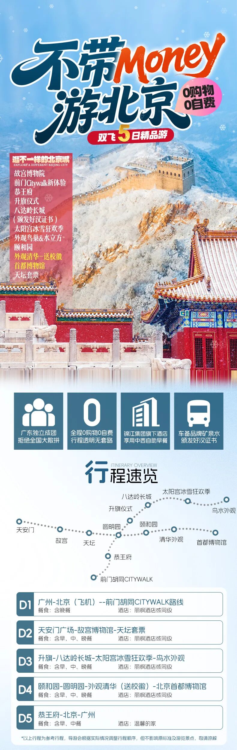 1.故宫(门票以官网为准) 每日限流,门票提前7天预约,售完为止!放票后第一时间给你抢票,若抢票失败,如未预约成功则替换为其他景区,景点替代方案最终以当团导游人员调整为准;门票差价多退少补;如客人不同意调整方案的则按照门票价格退一赔一处理)。另外需要注意:故宫景区周边无停车区域,临时上下车需步行一段距离及等候若干时间,敬请谅解。故宫为实名制请您一定要携带身份证件才能入内,如学生儿童没有身份证请带户口簿或者护照入馆。