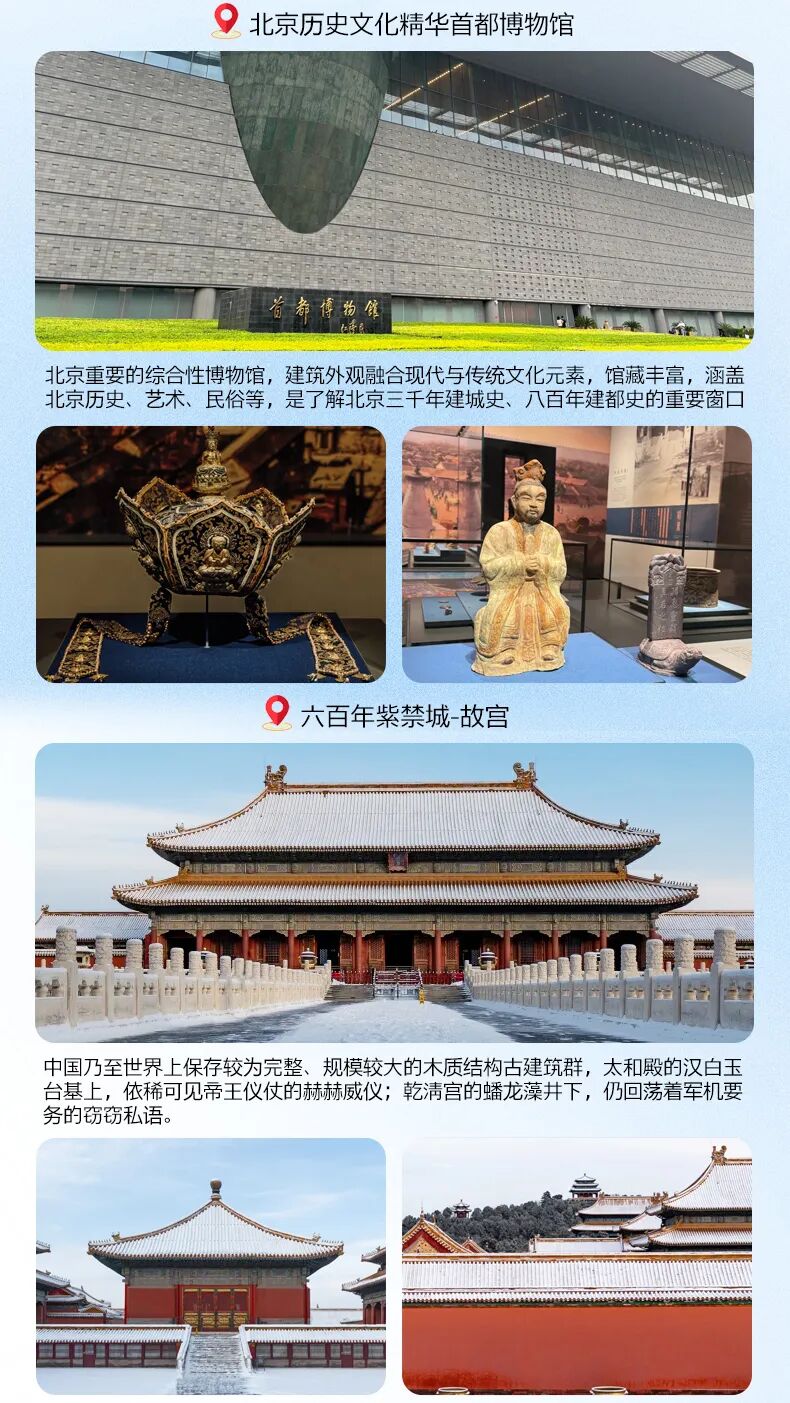 下午:【北京历史文化精华-首都博物馆】北京重要的综合性博物馆,建筑外观融合现代与传统文化元素,馆藏丰富,涵盖北京历史、艺术、民俗等,是了解北京三千年建城史、八百年建都史的重要窗口。主要展厅:《古都北京·历史文化篇》重点文物 :西周青铜器、元代青花瓷、明清宫廷器物。《京城旧事·老北京民俗展》了解四合院模型、京剧戏服、传统手工艺品。《古代瓷器艺术精品展》展示历代瓷器精品,包括宋元名窑、明清官窑瓷器。《古代佛像艺术展》汇集汉传、藏传佛教造像,展现佛教艺术发展历程。