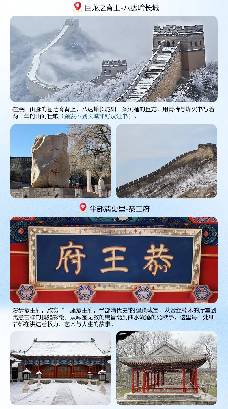 2、如未能约到相应景点门票,旅行社会优先为客人安排替代景点方案(注:故宫未能成功订票,调整为景山公园及恭王府游览,其他收费景点替代方案最终以当团导游人员调整为准,如客人不同意调整方案的则按照门票价格退一赔一处理)。