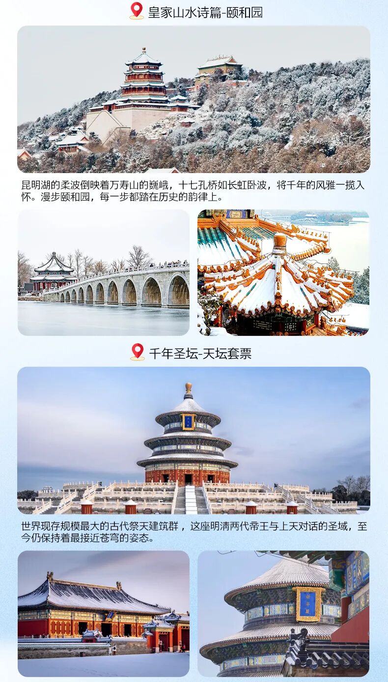 上午:早餐后,【皇家山水诗篇-颐和园】(游览约2小时左右),昆明湖的柔波倒映着万寿山的巍峨,十七孔桥如长虹卧波,将千年的风雅一揽入怀。漫步颐和园,每一步都踏在历史的韵律上。