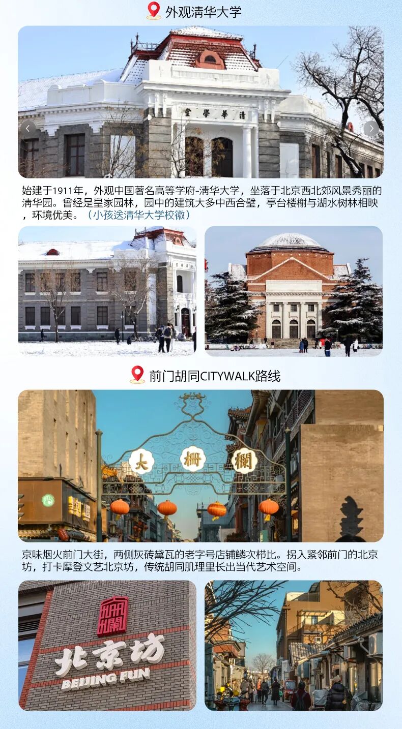 下午:【前门胡同CITYWALK路线:京味烟火前门大街-摩登文艺北京坊】京味烟火前门大街,漫步青石铺就的街道,两侧灰砖黛瓦的老字号店铺鳞次栉比,全聚德、都一处、张一元、六必居等老字号美食聚集地。拐入紧邻前门的北京坊,打卡摩登文艺北京坊,传统胡同肌理里长出当代艺术空间。