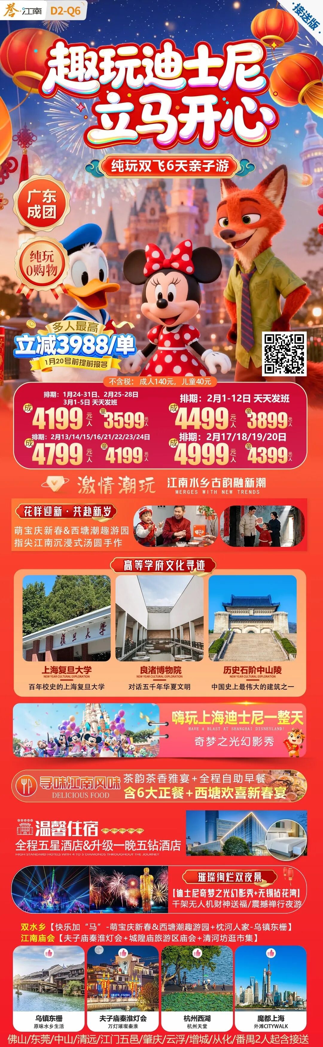 3、用餐:行程中含5早6正,酒店内含早餐,正餐35元/人,西塘新春宴60元/人(儿童减半);十人一桌八菜一汤(若不足10人一桌,则相应减少菜量);行程中所附菜单会根据季节、时令等因素有部分调整,我们按承诺标准确保餐饮卫生及餐食数量,但用餐条件与您的家乡有一定的差异,不一定满足游客口味需求,敬请见谅!