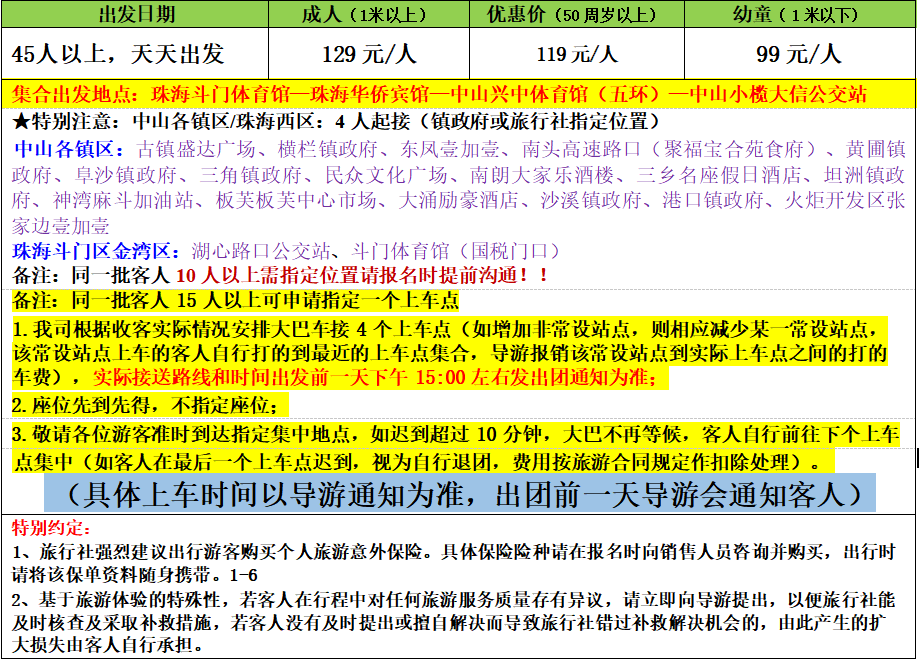 4.含行程上景点第一道大门票;【此团为特价团,不能使用任何优惠政策。无门票优惠返还】
