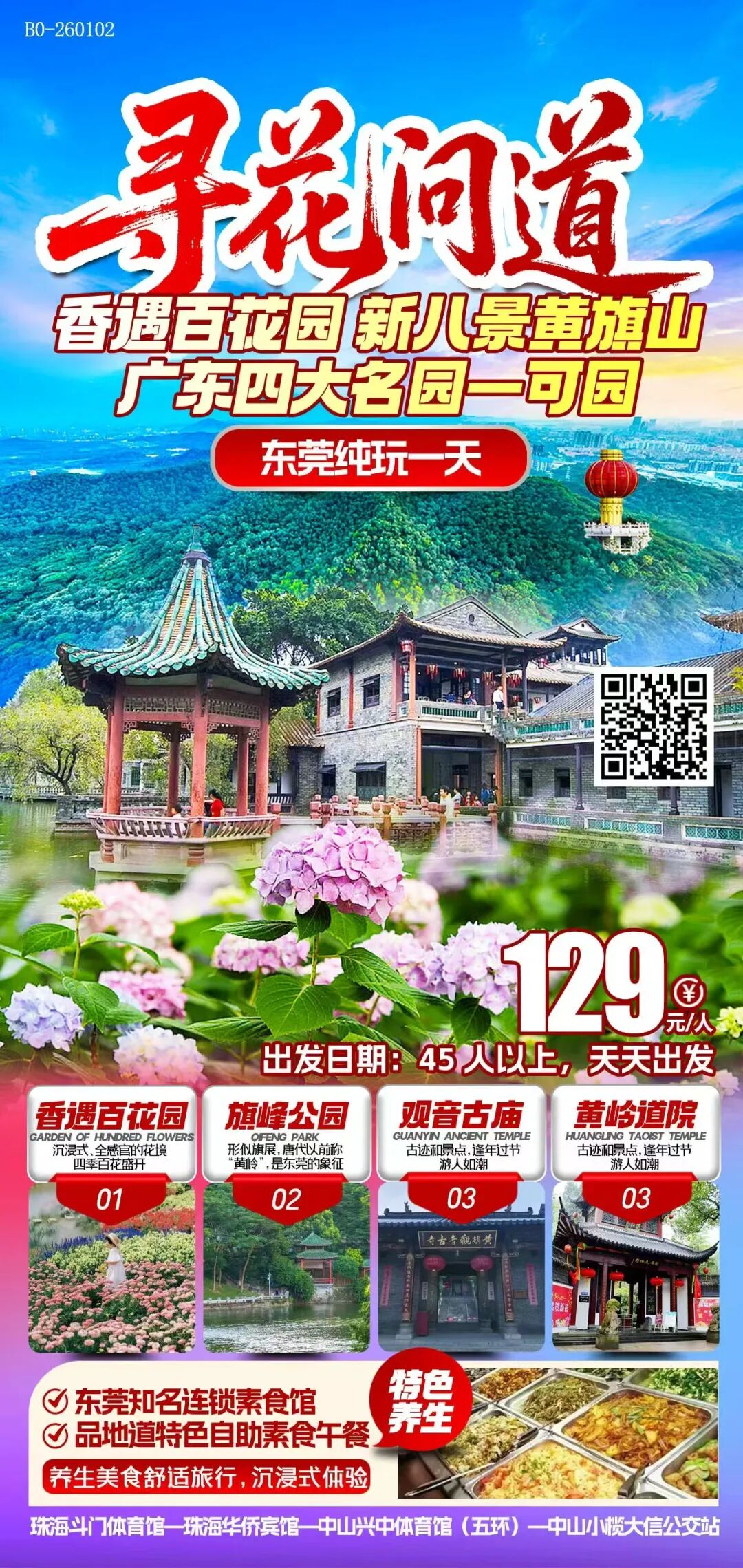 享用午餐(素食自助午餐)。餐后前往【旗峰公园】内有海拔 189 米的黄旗山,形似旗展,唐代以前称“黄岭”,是东莞的象征。“黄旗岭顶挂灯笼 ”是民间传说的东莞八景中的第一景。山下有建于宋代的黄旗【观音古庙】和【黄岭道院】等古迹和景点,逢年过节,游人如潮。