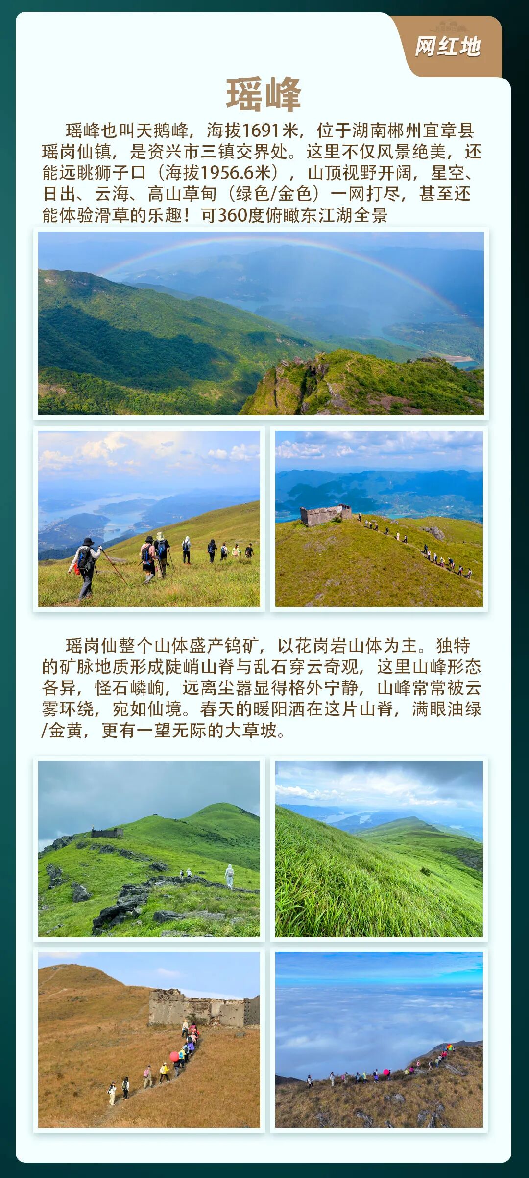 8.30抵达瑶岗仙镇整理装备,热身破冰,开始徒步,沿机耕路,山野一路抵达山脊线攀升,沿着风景如画的瑶峰山脊线,徒步翻越,迎接那万亩高山草甸的盛情邀请。这里的草原辽阔无垠,令人叹为观止。而那壮观的云海与绚烂的日出,更是将这里装点得如诗如画,令人流连忘返。修整后冲顶海拔1691米界碑拍照打卡,这里可以俯瞰远眺东江湖全景,还可以体验滑草(有一定风险)随后沿山脊线环线下山不走回头路(全程耗时约7-8小时)(如遇特殊情况封山改走资兴八面山)