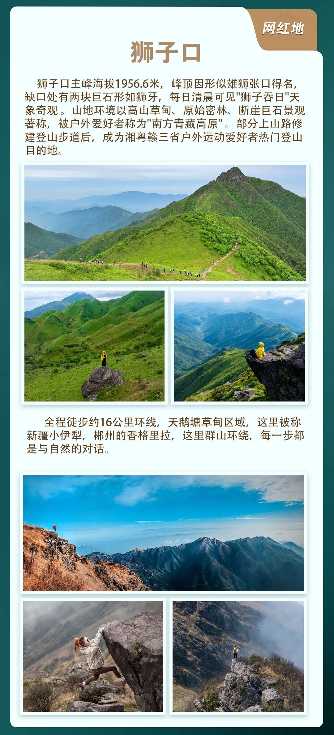 8.30抵达来洋洞整理装备,热身破冰,开始徒步,沿水泥路,机耕路,山野一路抵达天鹅塘(郴州版阿勒泰)运气好还可以与山牛,野马零距离接触,休息片刻后开始冲顶主峰海拔1956米界碑拍照打卡,随后沿山脊线环线下山不走回头路(全程耗时约8-10小时)