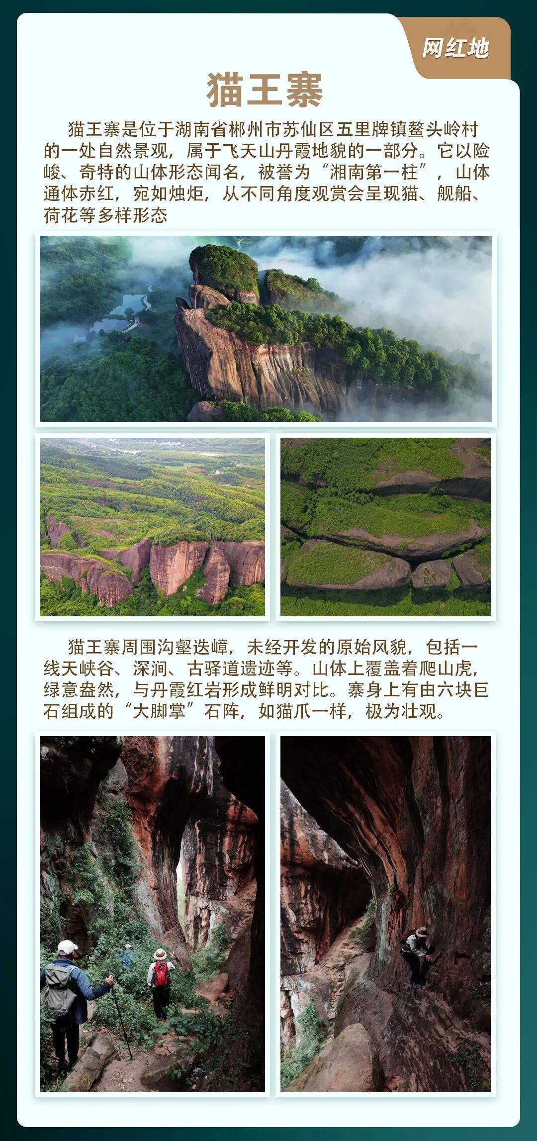 12:00前往猫王寨,路上经过最美丹霞公路之一马皇丘大峡谷。中国十大最美公路之一,分分钟出大片!全长约3-5公里,前半部分道路两边光滑无物,都是丹霞地貌,后半部分道路两边竹林环绕。沿路中间还有土匪洞(黑坦穿坦),阴原石游玩