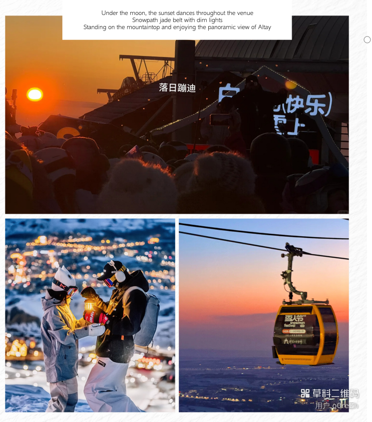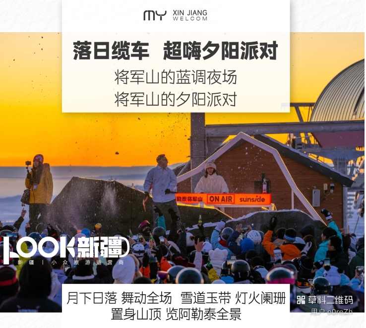 等一场“日落金山”的美景。当阿勒泰的日落烧红天际,将军山的风都染上浪漫。橘粉霞光漫过雪坡,DJ 台响起鼓点,踩着积雪蹦跳,每一步都撞碎夕阳的碎片。这才是年轻人的日落正确打开方式!