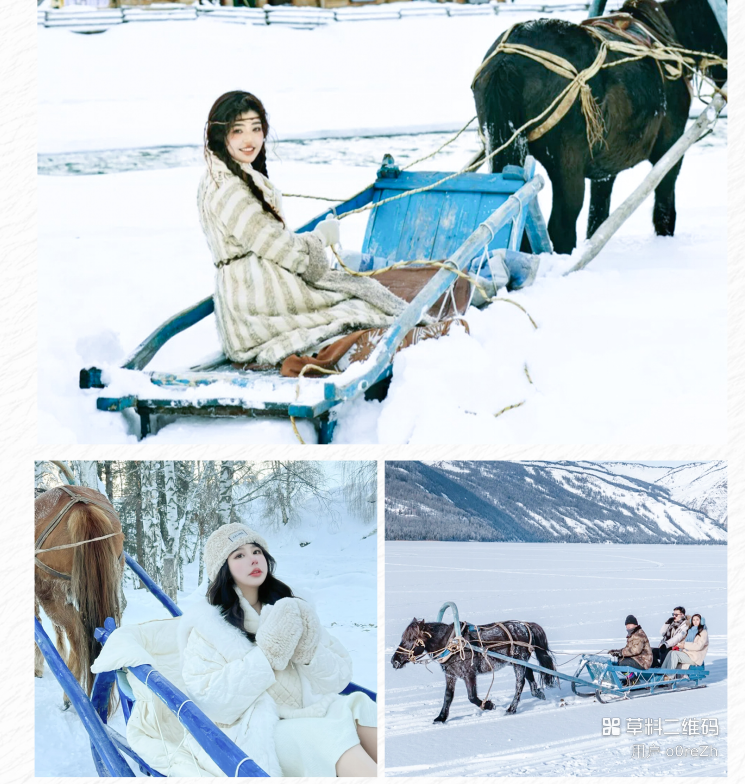 在喀纳斯体验【马拉爬犁】(停车场-湖边),马鬃甩着风,爬犁在雪上“嗖”地窜出去!雪沫子溅到裤脚,耳边是马蹄踏雪的“哒哒”声,比坐过山车还带劲~裹紧围巾伸手接雪,看沿途的树往后跑,这慢悠悠又超欢乐的冬日限定,谁坐谁上瘾!马拉爬犁预计11月20日左右开始运营,营业之前无退费