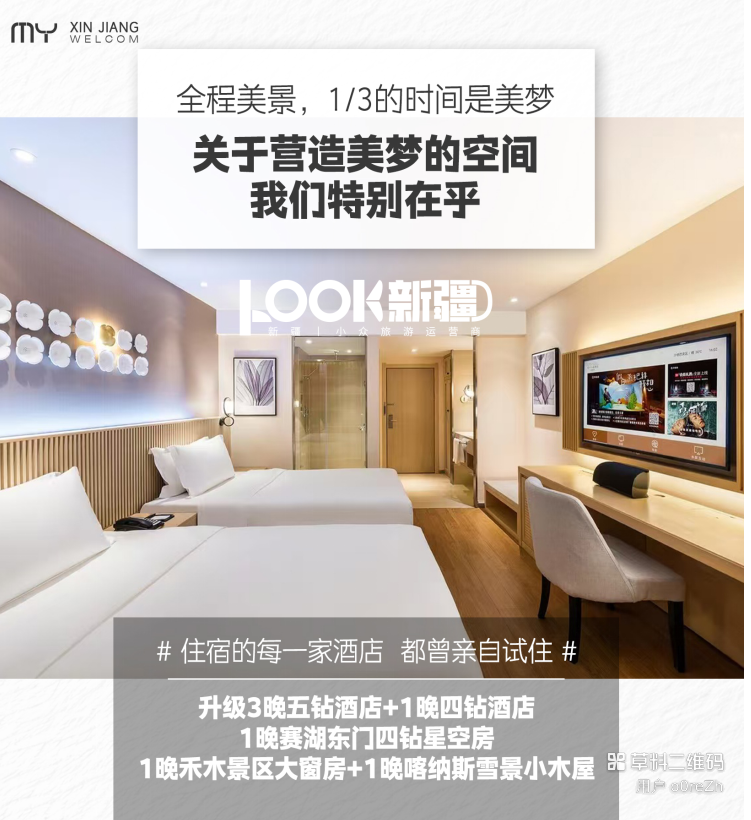 旅行住宿:全程7晚住宿,升级3晚携程五钻酒店,2晚携程四钻酒店(含1晚赛湖东门四钻星空房),2晚喀纳斯/禾木景区特色民宿;(默认双人间拼住,新疆酒店标准三人间较少 ,如有单人坚持单住 ,需补齐整间房差),拼住者为本团游客或他团游客或司机,如不同意,则补足单房差,一个成人带1个小孩,儿童必须占床位;