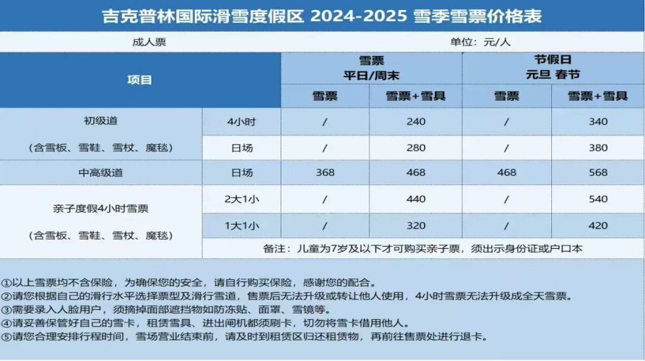 吉克普林滑雪场介绍:(此为2024年信息,仅为参考,待2025年新的信息出来再次更新)