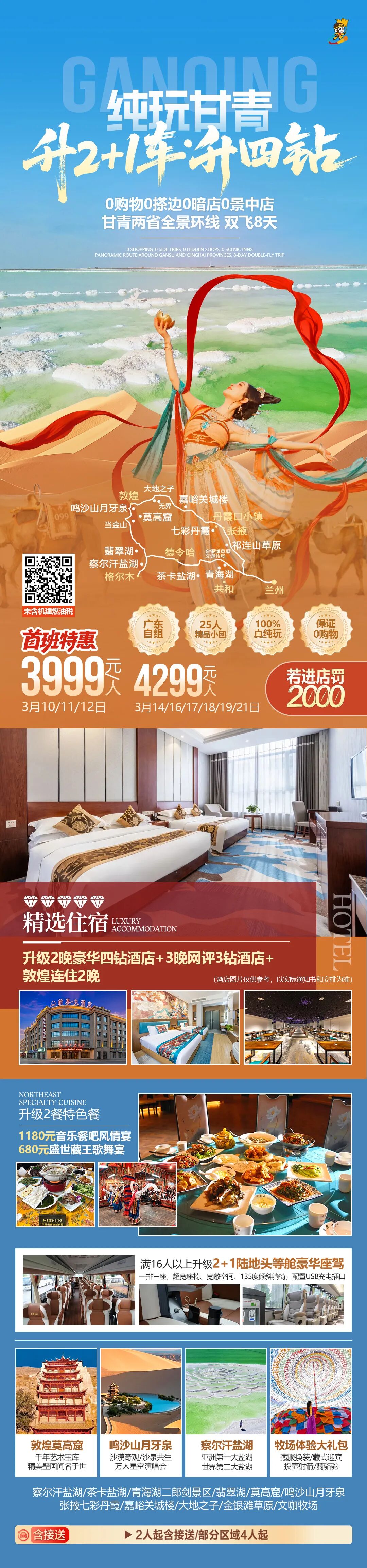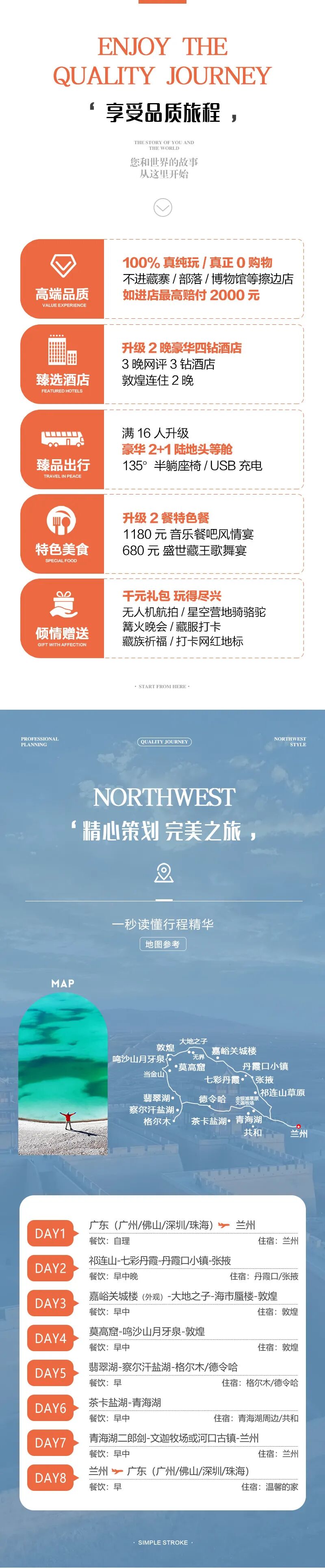 3、住宿:升级2晚网评4钻酒店(当地五星未挂牌)+3晚网评3钻酒店(当地四星未挂牌)+2晚青海舒适型酒店 (特别提醒:西北地处青藏高原,海拔较高,夏季温度较低,被称为夏都,故绝大多数酒店无空调。酒店设施条件有限,请勿以城市人心态衡量。敦煌2晚连住不挪窝) 参考酒店: 兰州:罗曼假期、敦煌之星酒店、兰州凯莱宾馆、星如海宾馆、爱琴海、华文丹迪、世家酒店、安宁东府、兰石润安、 东府酒店、兰石香智、兰东宾馆、连铝宾、宾如归、安吉宾馆、99优选酒店、三心怡宾馆、久雅宾馆、华山宾馆 忠华宾馆,天龙宾馆。 3-4月产品升级四钻酒店新泰酒店、敦煌驿馆、驼峰宾馆或同级 张掖:石头城酒店、星辰风尚酒店、智选假日酒店、张掖都城假日酒店、西遇酒店。 敦煌:新泰大酒店、驼峰酒店、川渝酒店或同级;安和酒店、品逸大酒店、敦煌喜迎缘、庆华酒店、敦煌锦富酒店、敦煌途窝夜市店、玺迎缘大酒店、方舟大酒店、西部大酒店、祁连大酒店、悦天酒店、隆丰大酒店、桓宇大酒店、安和大酒店、锦都大酒店。 德令哈:红晶天酒店、恒欣宾馆、佳悦商务酒店、伊正宾馆、万豪假日酒店、优雅商务宾馆、星期五时尚酒店、腾瑞 祥酒店、坤宜酒店、德都大酒店、德勒大酒店、聚龙宾馆、海康商务宾馆。 格尔木:万客聚酒店,水电宾馆,凯斯顿酒店,圣柏利酒店或同级 青海湖沿线/共和:海宴宾馆、蓝宝石酒店、醉仙楼酒店、鑫豪酒店、欣欣酒店、鑫豪宾馆、怡然宾馆、闽原宾馆、瑞和庄园酒店、海湖商务宾馆、兴泰商务、金河商务宾馆、永恒宾馆、宗喀商务宾馆、天天假日酒店、桥顺酒店、 启航酒店、高原红酒店。 注:如遇旺季酒店接待大型会议或政府临时征用等特殊情况,我社有权调整为同等级别酒店。