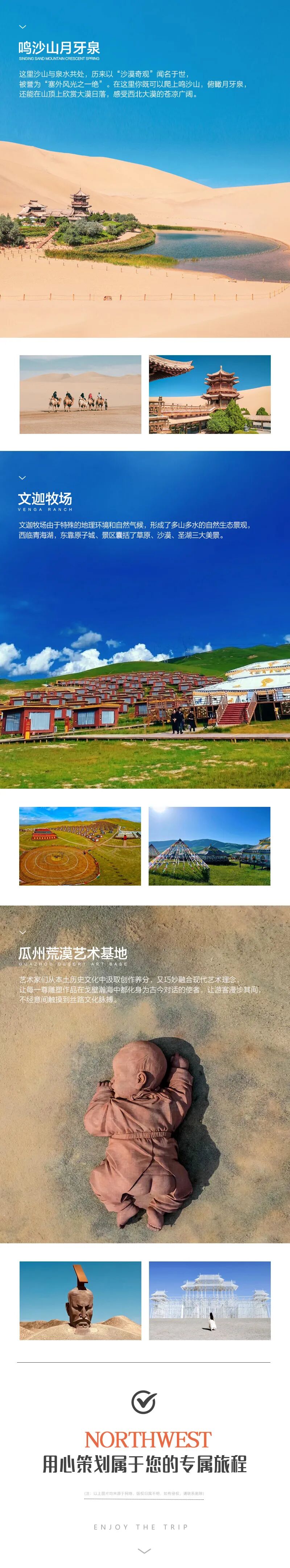 敦煌的二个景点<莫高窟、鸣沙山>的参观时间会根据实际情况进行先后顺序的调整(有可能调至前一天或后一天),调整前不再通知,敬请理解。
