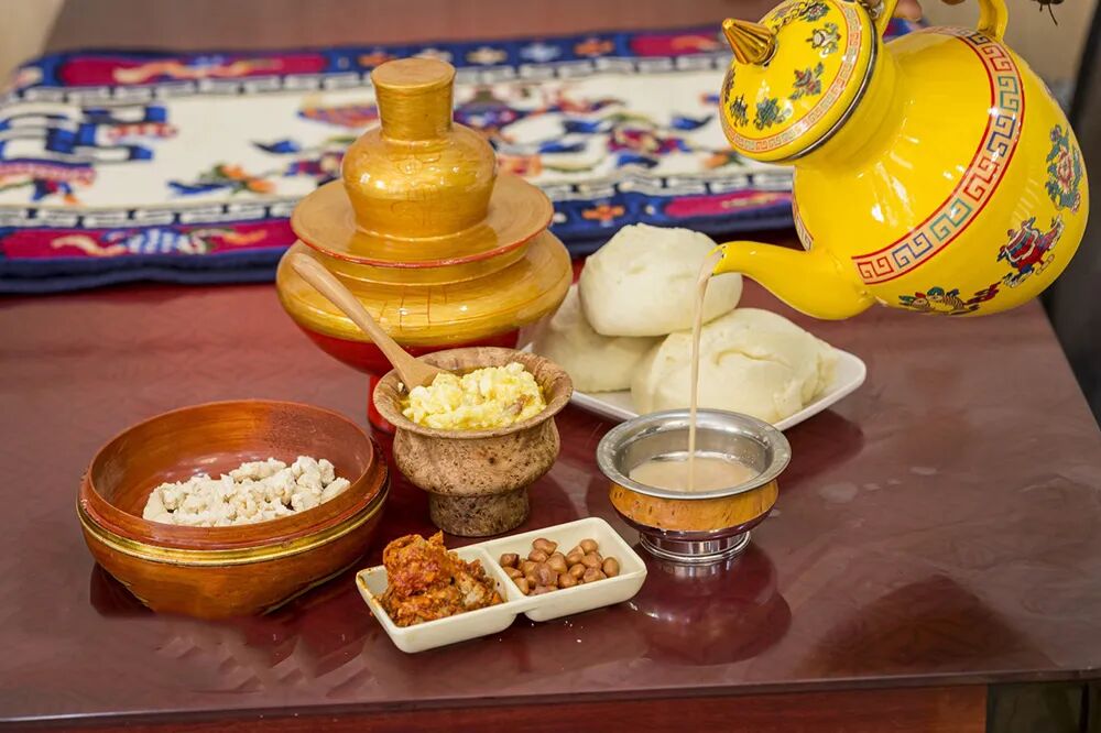 藏式下午茶点:品尝奶茶、奶贝,饼干等。