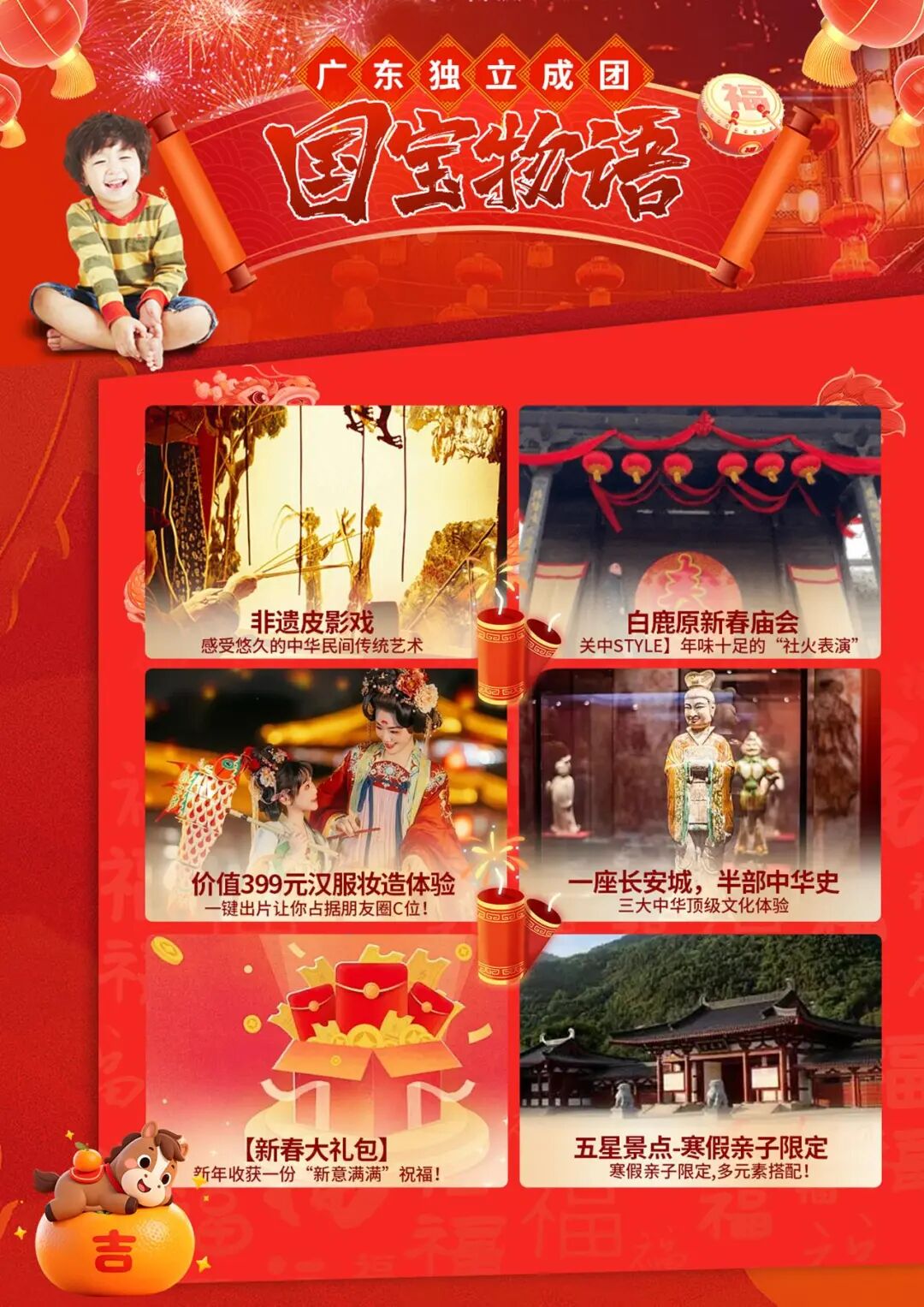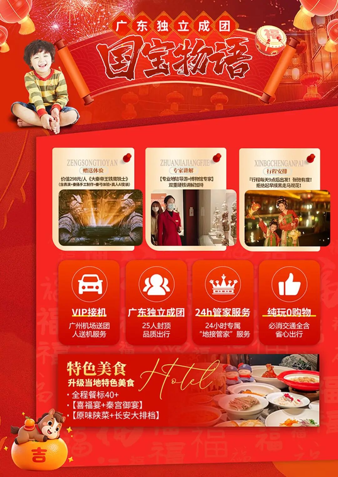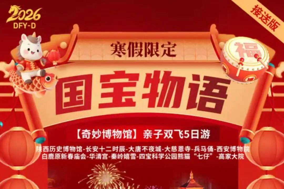国家宝藏→陕西历史博物馆·秦始皇陵兵马俑·秦俑DIY·西安博物院·长安十二时辰·白鹿原关中大庙会·华清宫唐“潮”盛典·大慈恩寺祈福纳祥·大唐不夜城花灯会·高家大院皮影戏·秦岭嬉雪·四宝科学公园熊猫“七仔”闹新春·亲子换装汉服妆造体验双飞5天