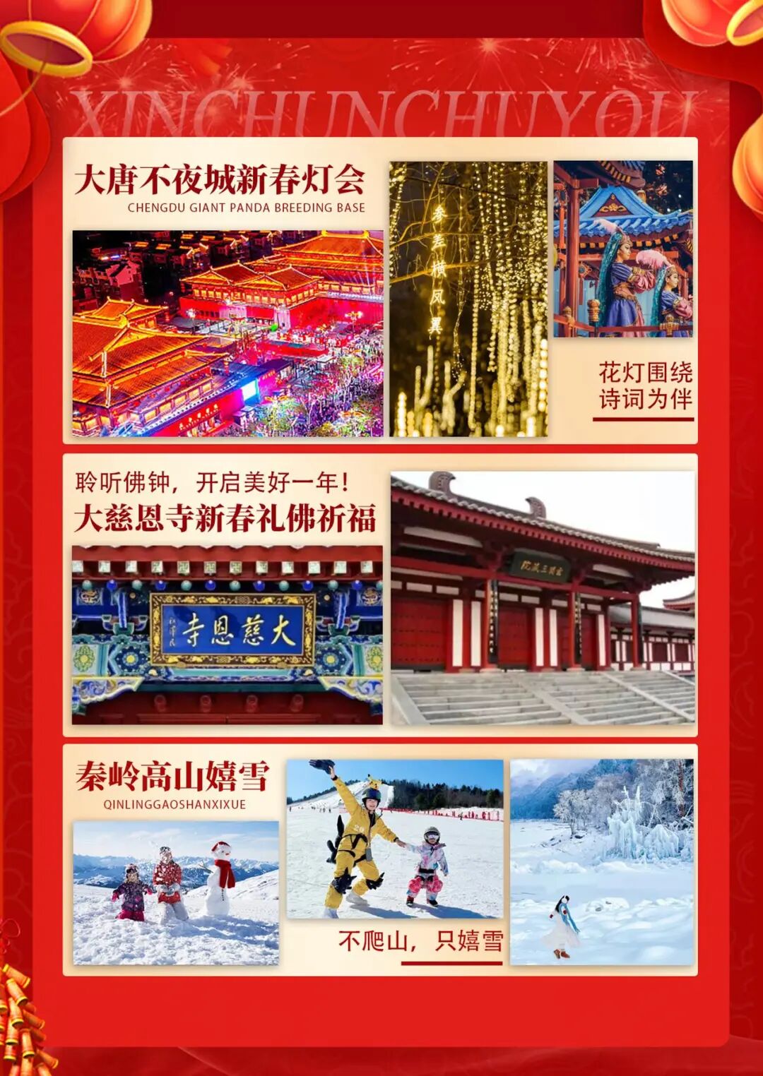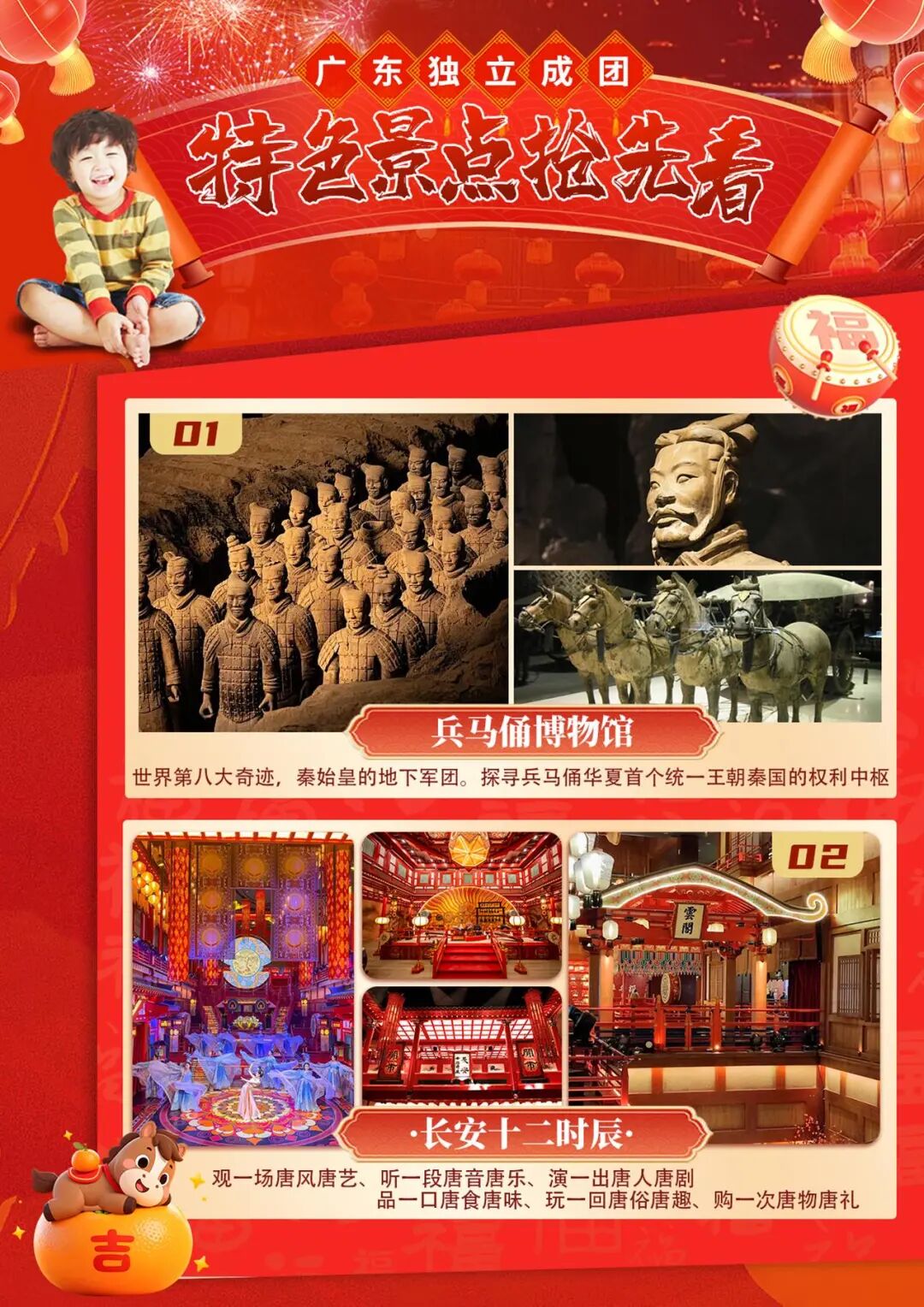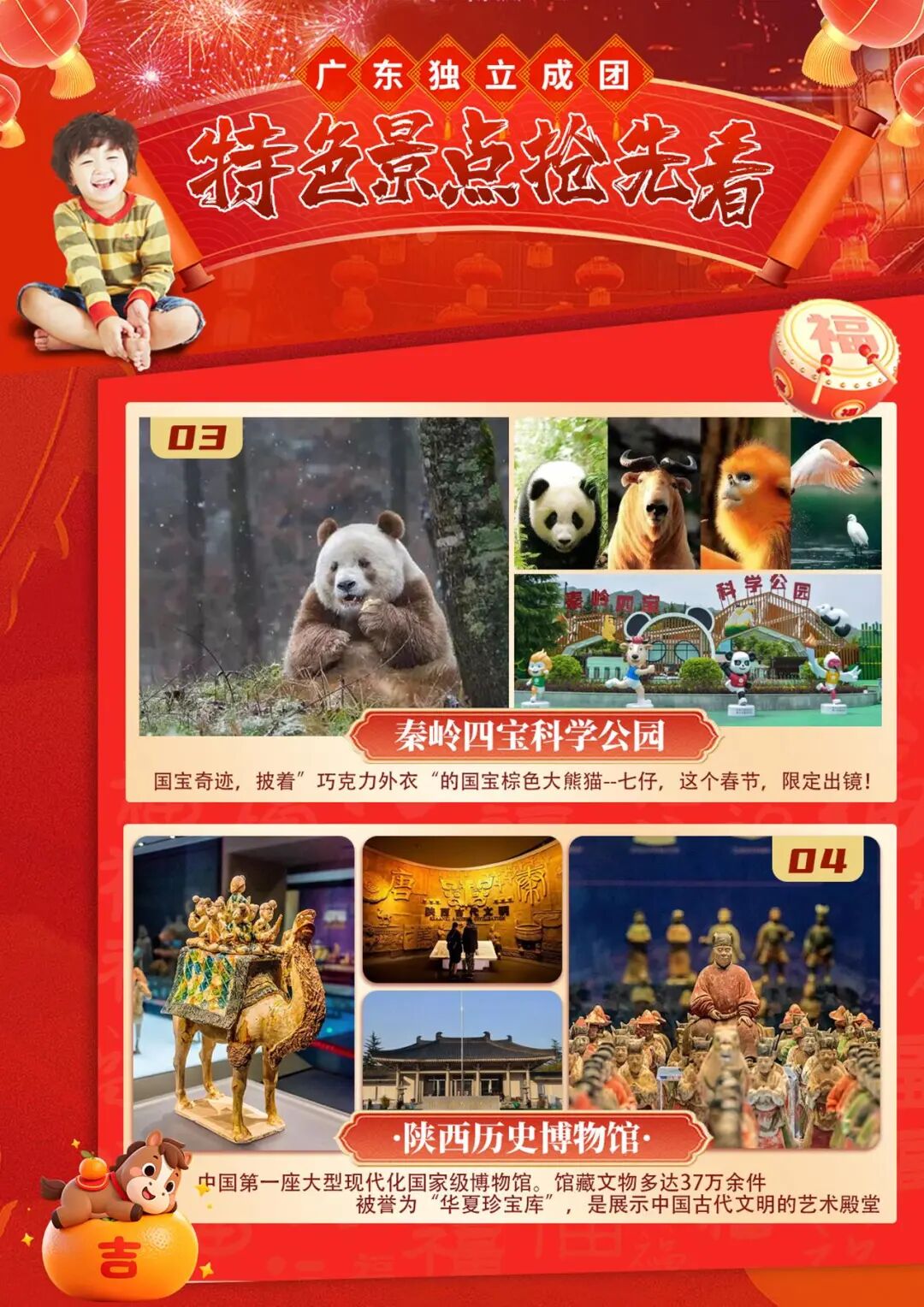 国家宝藏→陕西历史博物馆·秦始皇陵兵马俑·秦俑DIY·西安博物院·长安十二时辰·白鹿原关中大庙会·华清宫唐“潮”盛典·大慈恩寺祈福纳祥·大唐不夜城花灯会·高家大院皮影戏·秦岭嬉雪·四宝科学公园熊猫“七仔”闹新春·亲子换装汉服妆造体验双飞5天
