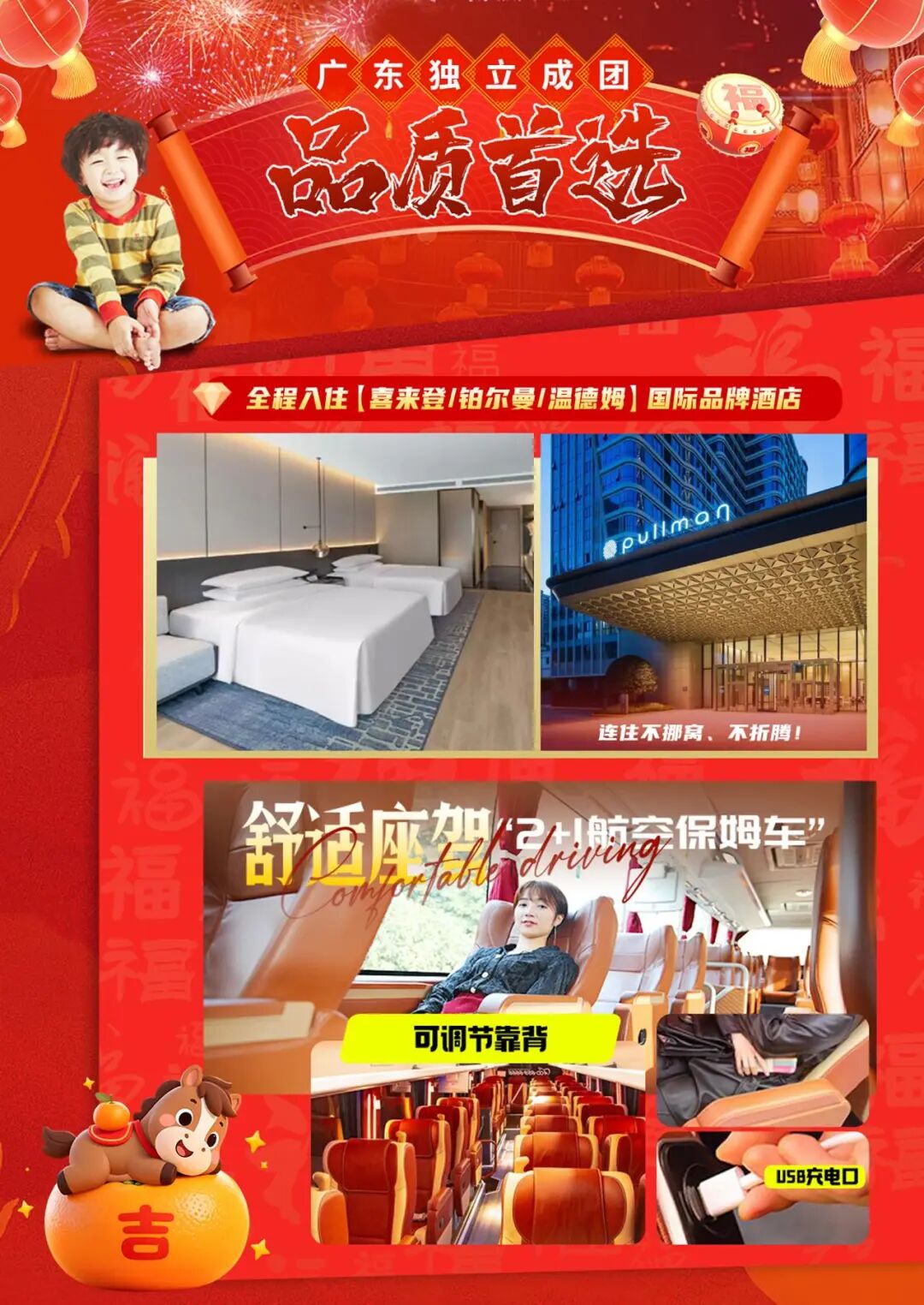 用车:用车将根据团队人数安排9-55座的空调旅游车,保证每人1正座。