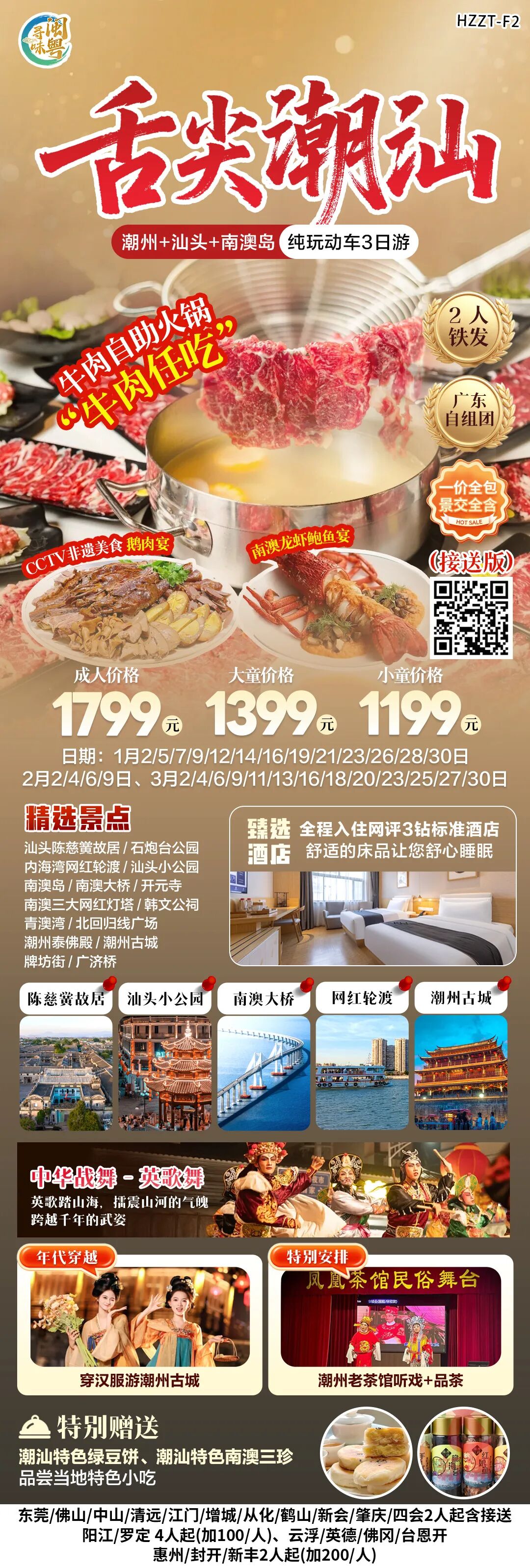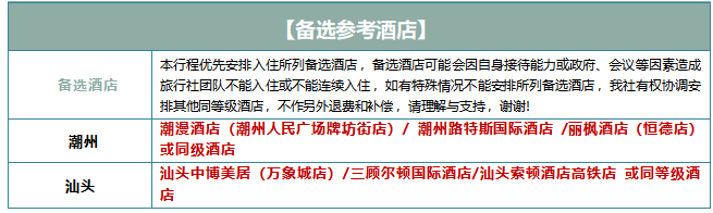 【成团人数】:本团 2 人铁发(重要提示:若团队为 8 人(不含 8 人)以下 ,司兼导、退餐费 ,客人正餐自理;) 【大交通】 :广州/东莞/深圳/惠州往返潮汕二等座高铁动车票(具体高铁动车班次以出票为准)如遇法定节假