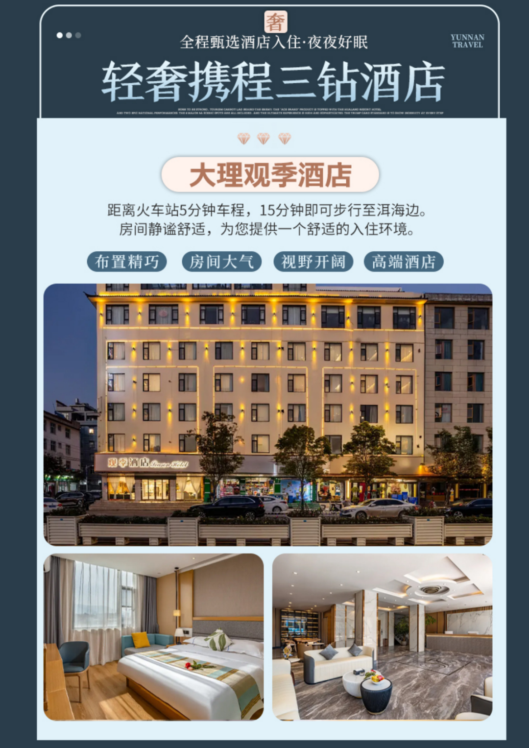 酒店参考:悦莱酒店 雄宝酒店 艾菲特、广怡 ,景然大酒店、盛都酒店、锦兴酒店、神洲酒店、宏宇酒店,大理观季酒店,天乡仁和酒店或者同级