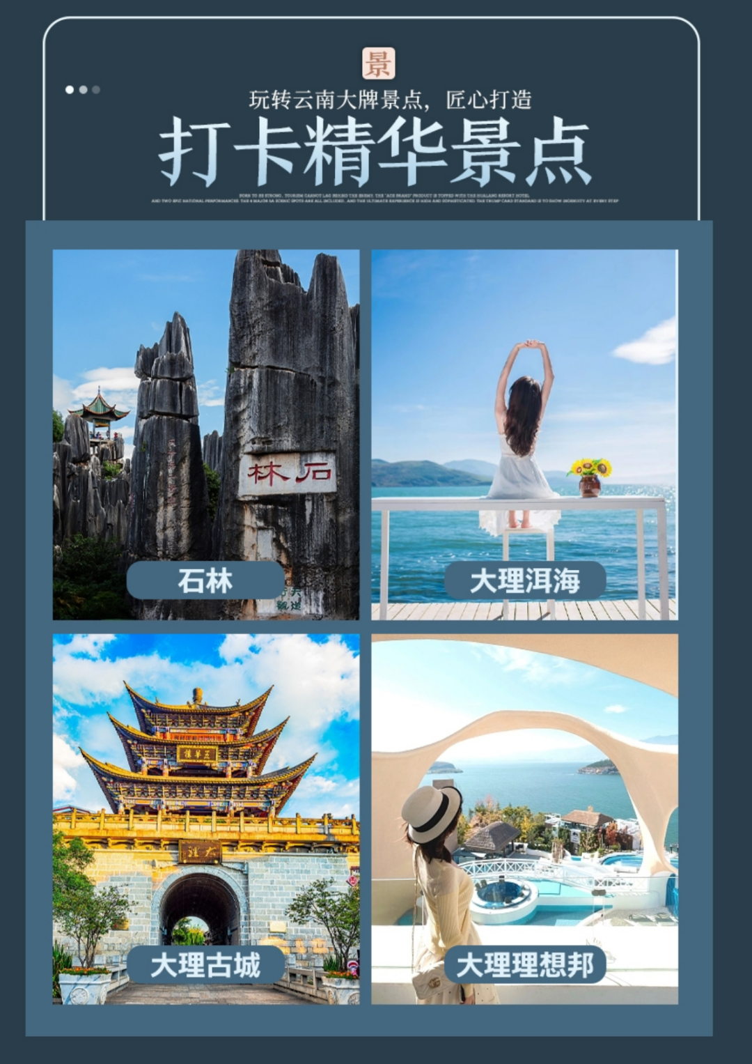 请您根据机票起飞时间提前2小时自行乘车到深圳/广州机场,凭身份证领取登机牌,之后前往美丽的春城昆明,后接机入住昆明酒店。让我们一起展开吃吃吃、赏赏赏、拍拍拍、逛逛逛、游游游、泡泡泡、买买买的度假模式吧。