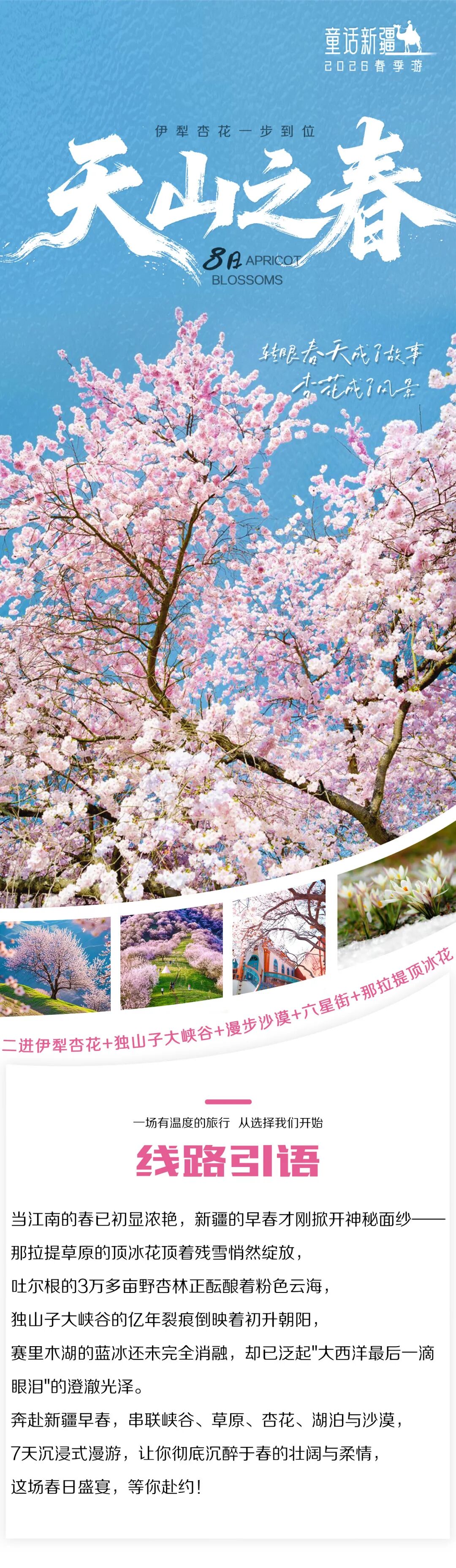 今日早起乘车前往"新疆早春顶流"——吐尔根杏花沟。这里拥有3万多亩公元14世纪遗留的原始野生杏树林,每年3月底至4月中旬花期到来时,漫山遍野的粉白杏花如云似霞,在起伏的山地上铺展成壮阔的"粉色云海",是摄影爱好者的天堂。下午离开杏花沟,前往酒店入住。
