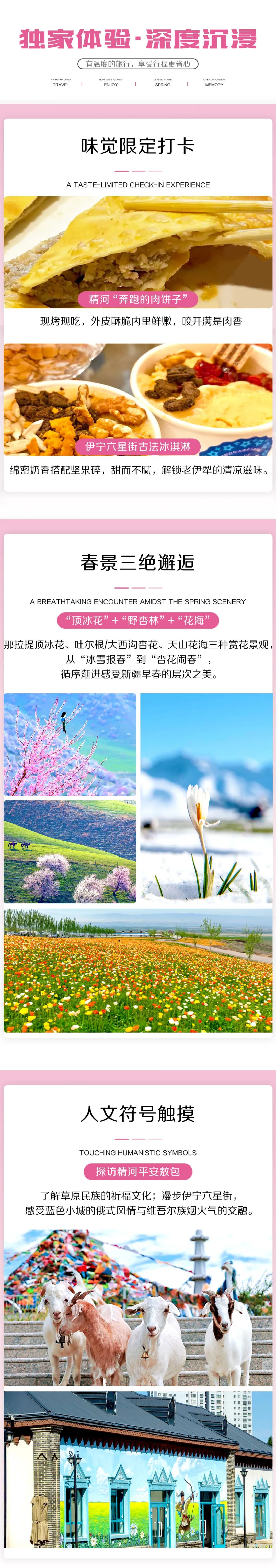 今日早起前往恰西森林公园,恰西森林是伊犁最先绿的草原,当未融的白雪和浩荡的草原邂逅,浪漫的春光便惊艳了整片山谷,恰西森林就摇身一变,成了画卷里的“塞上江南”。草原、雪山、森林同框最美的地方就是“恰西画卷”。游览结束后前往天山花海景区,当春风温柔拂过,整个景区像是被打翻了调色盘。大片大片的二月兰肆意绽放,紫的如梦,每一朵都亭亭玉立,在微风中轻轻摇曳,虞美人,苹果花,桃花也都竞相开放,争抢着诉说春天的故事。前往伊宁,抵达后首先打卡六星街的古法冰淇淋,绵密的奶香搭配香脆的坚果碎,甜而不腻,消解旅途疲惫。之后可在六星街自由漫步,感受俄式建筑与维吾尔族风情交融的独特韵味,蓝色的门窗、盛开的鲜花都是绝佳的拍照背景。后前往酒店入住。