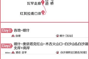 注意事项:1.如遇塔莎古道无法通行,则沿G314(乌红线)原路返回喀什,费用不变。