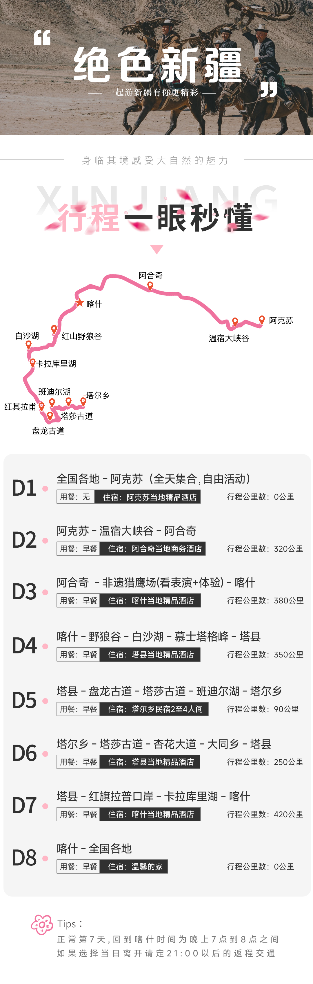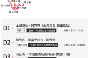 【集合地点】阿克苏指定酒店,请报“绝色新疆”+姓名拿房,酒店入住时间14:00后,提前抵达可将行李寄存在酒店前台;