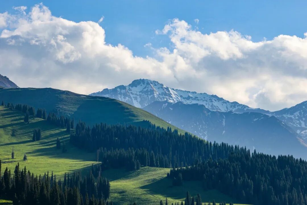 早上吃过早餐后驱车前往恰西,塞外江南在伊犁,伊犁最秀是恰西。恰西国家森林公园是著名林区,有着连绵不绝的雪岭云杉,国家农业展览馆陈列的“云杉王”截样就出自这里。夏天的恰西,水草丰茂、环境优美、牛羊成群,恰西河贯穿景区,两侧为中低山,远处是那拉提山诸高峰,东西两侧低山如垣,东侧山峦芳草绿茵,西侧山峦苍松凝翠,山顶角峰林立,冰山隐约可见。每到六七月,恰西草原进入一年之中最美季,水草丰茂,风景如画。一群群牛羊在蓝天、绿草间游动,恬静而悠然;星星点点的毡房,在湛蓝的天空下,于盈盈绿草间闪着耀眼的白光草原深处,苍鹰自由翱翔,草丛中,土拨鼠正悄悄张望。蓝天、白云、绿草、羊群、马群组成一幅大自然的神奇画卷。徜徉恰西草原,幽深的峡谷、蜿蜒的河水,皑皑的雪山、绿绿的草毯,挺拔的云杉、游荡的牛马......像是天地间的美好组合叠加在一起,屏蔽了尘世间的一切喧嚣。