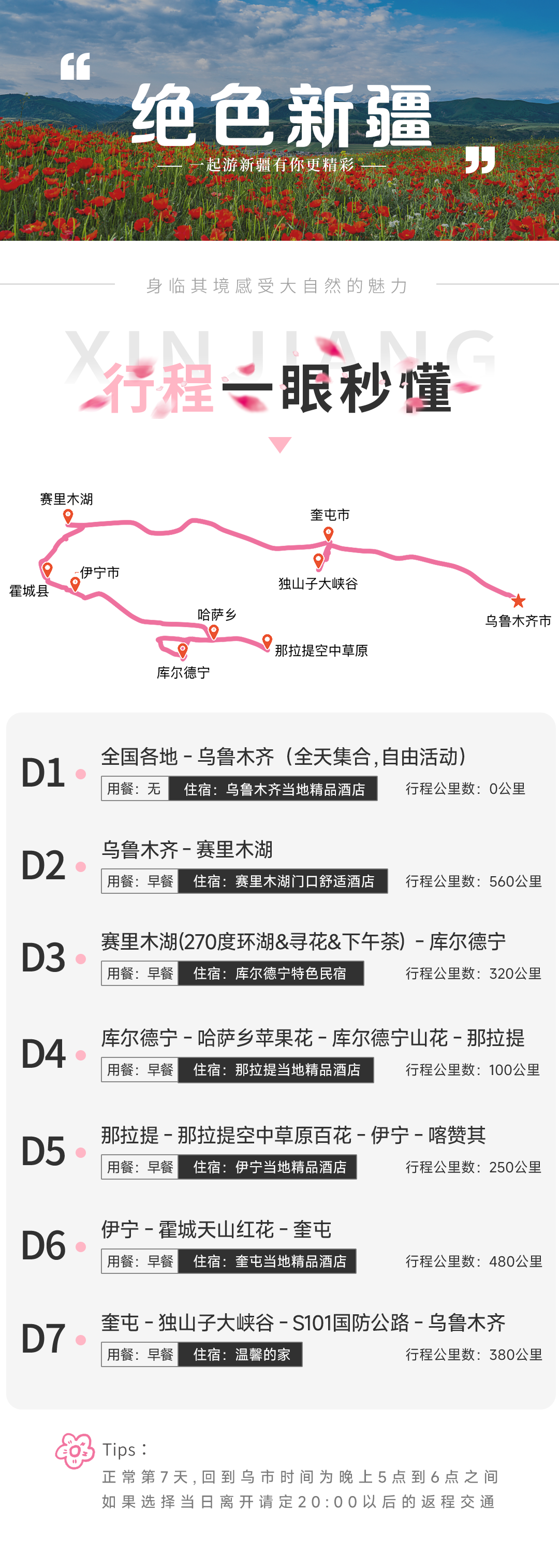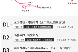 【集合地点】乌鲁木齐市区指定酒店,请报“绝色新疆”+姓名入住,酒店入住时间14:00后,提前抵达可将行李先寄存在酒店前台先出去游玩,贵重物品请随身携带,自由活动期间注意安全;