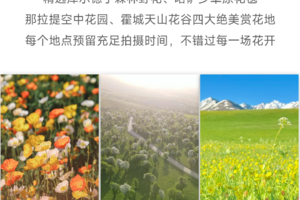 早餐后前往“中国最美的地方”那拉提,列为全国六大最美的草原之一。四月底五月初的那拉提草原已经花开遍地,绿草与蓝天相接,牛羊相互追逐。即使随手一拍,都美成一张张明信片。雪山、森林、山丘、鲜花、草甸,完美的结合在一起,这满目的绿色,太养眼,让人忘却尘世的一切烦恼。然后前往伊宁,入住酒店后还可以自行前往喀其赞民俗村,这里是来伊宁必去看看的地方,那里的彩色房子非常漂亮,有一种蓝就叫喀赞其,比摩洛哥的蓝更漂亮。来到这里可以体验到最浓郁的“新疆味道”。