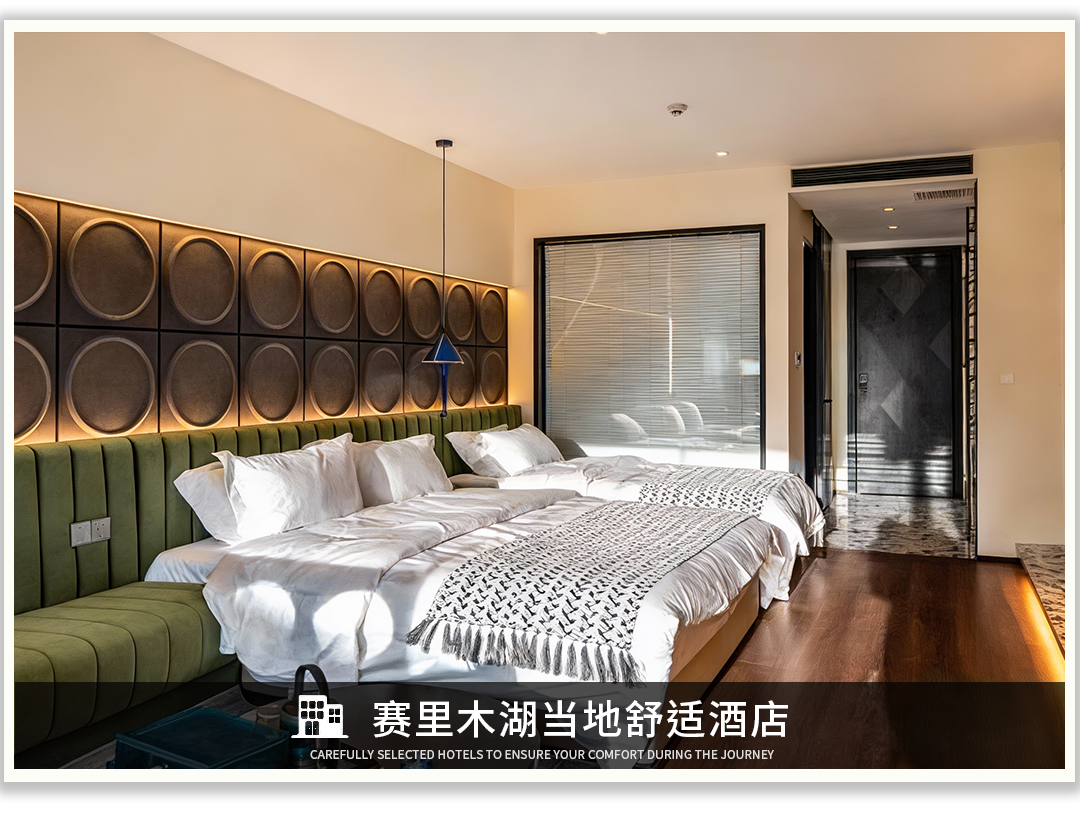 乌鲁木齐当地精品酒店(标间,独卫)*1晚,赛里木湖门口舒适型酒店(标间,独卫)*1晚,库尔德宁当地特色民宿(标间,独卫)*1晚,伊宁当地精品酒店(标间,独卫)*1晚,那拉提当地精品酒店(标间,独卫)*1晚,奎屯当地精品酒店(标间,独卫)*1晚,