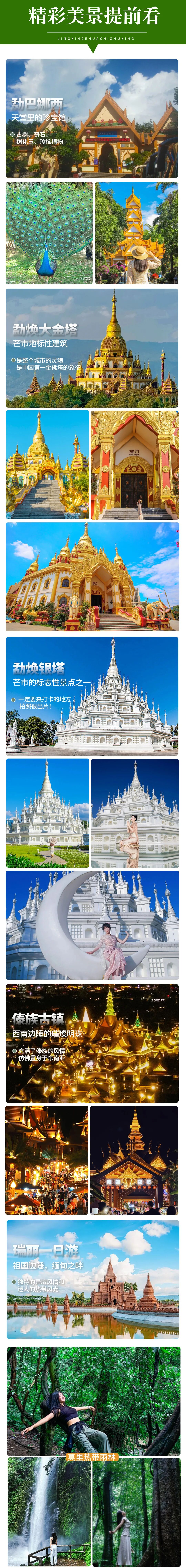 3.【异域风情】不用出国,在这里你就能体验到东南亚异域风情。热带雨林、佛寺佛塔、边关人文、青青草原、秘境古村、民族风情、休闲古镇、泡野温泉、徒步体验等众多元素结合。