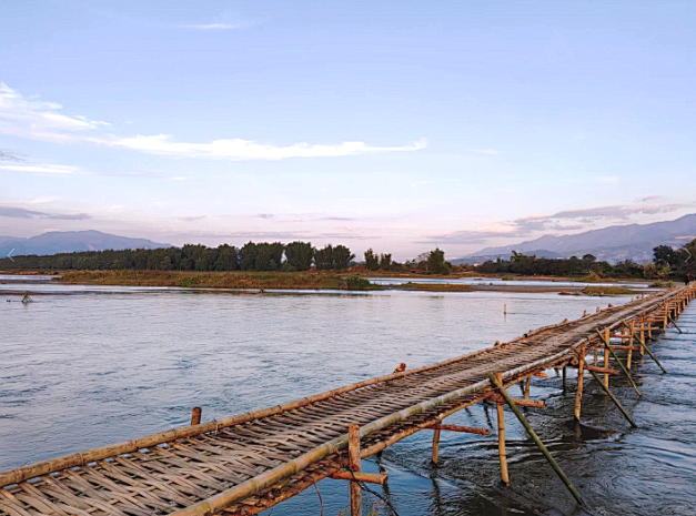 我们一起跳目瑙纵歌、品景颇水酒、尝过手米线、赏非遗技艺、享节日放松。载歌载舞,好不热闹。适时,我们离开陇川,到达另外一个美丽的边境小城—【盈江】,先打卡大盈江江面上的【网红竹桥】,当地傣族村民用最原始的方式,编织出了横跨两岸方便行人和摩托车通行的竹桥,300米长凝结傣族村民生活智慧的江上竹桥不仅方便了两岸往来,更成了盈江上不可多得的一道自然美景。这里也成为了又一个小众打卡网红地。