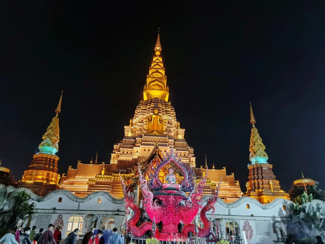 雄伟的景洪大金塔,塔身高66.6米,寓意一江连六国(中国、老挝、缅甸、泰国、柬埔寨和越南),在夜晚更加的辉煌耀眼,不禁让人流连忘返,仿佛置身在泰国。