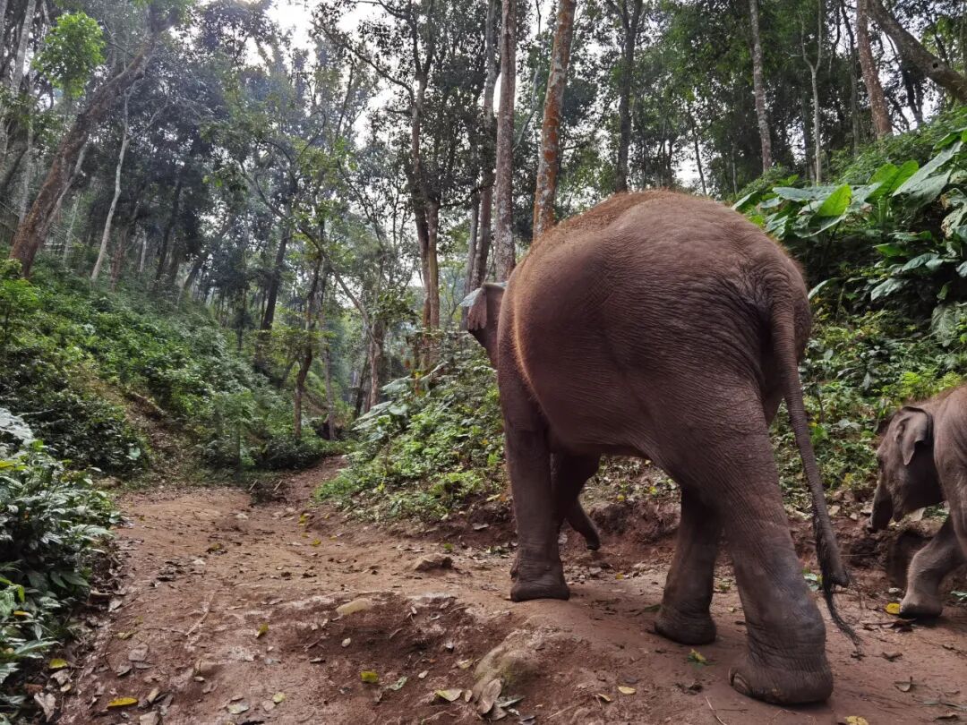 雨林牧象是野象谷内一项,跟随着工作人员来到一片静谧的森林里,和一大一小的两只象在森林里散步。既能参与到它们的生活里,又不会打扰到它们。