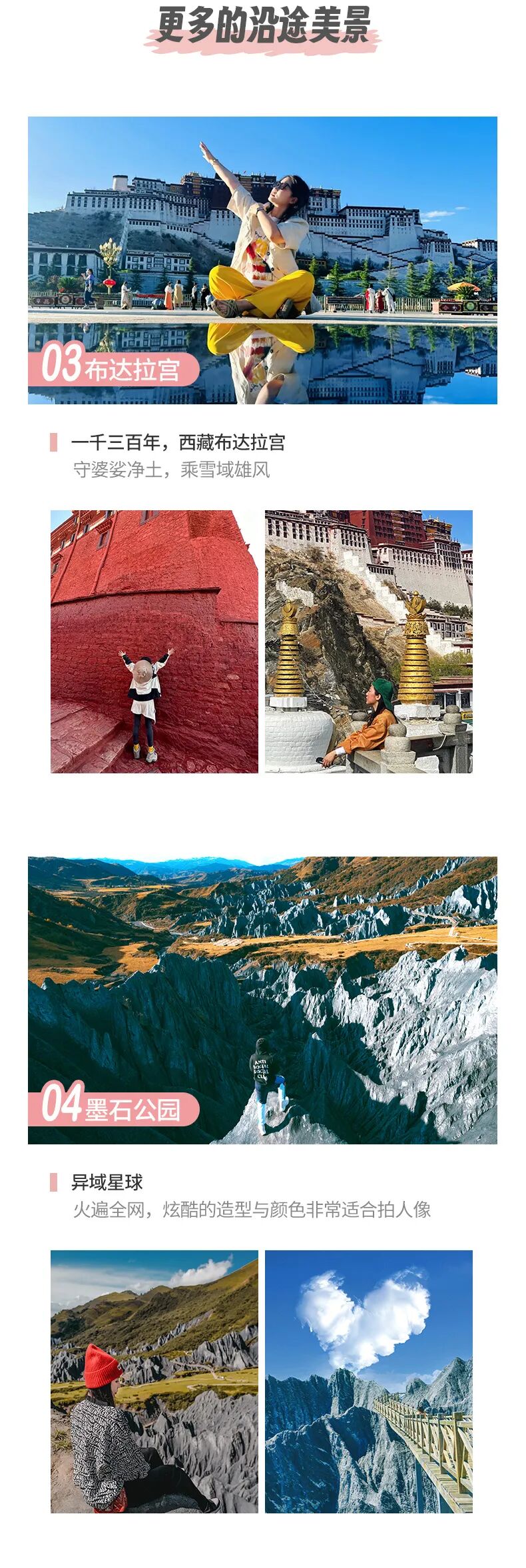 包含四姑娘山双桥沟门票、理塘套票、甲居藏寨门票、米堆冰川门票、雅鲁藏布大峡谷门票、墨石公园门票、嘎拉桃花村门票、布达拉宫门票