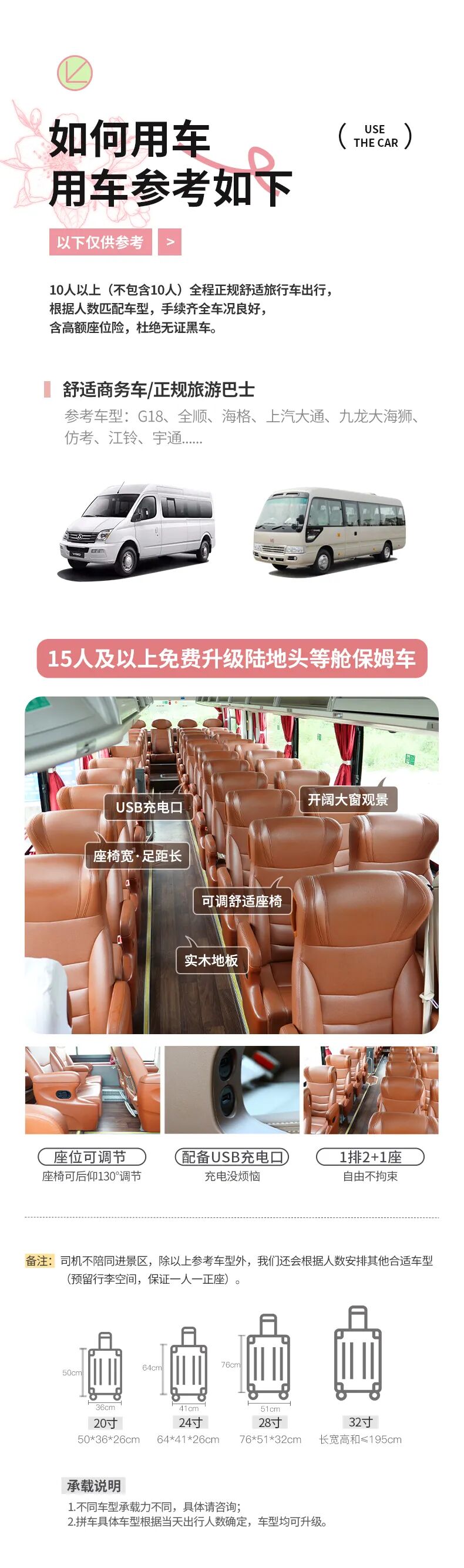备注:车型承载力有限,携带行李为24寸或以下行李箱。