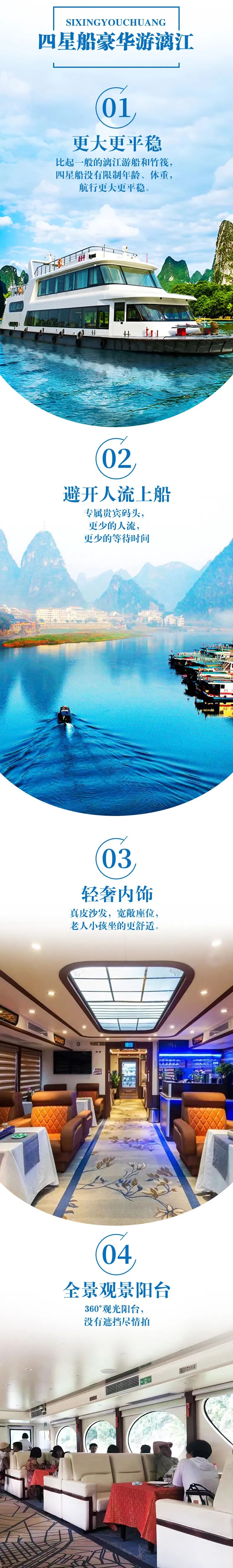 早餐后前往码头乘四星船游【漓江风光】(杨堤-草坪段/草坪-杨堤段,双层豪华空调游船,船游约1.5小时,具体船次旺季会根据当天船情况按实际安排)漓江既有“山清、水秀、洞奇、石美”四绝,又有“洲绿、滩险、潭深、瀑飞”之胜,人称“百里漓江、百里画廊”。草坪—杨堤全程6公里约70分钟风景区以由漓江一水相连,是世界上规模最大、风景最美的岩溶山水游览区。漓江两岸山峰挺拔,形态万千,江堤竹林摇曳,婀娜多姿,江中碧水萦回,奇峰倒影,每一处景致都旖旎如画。后前往游览“世界吉尼斯溶洞奇观”—【冠岩】(游览时间不少于60分钟,不含滑道或电瓶车往返60元/人自理现付导游),洞内千姿百态的石钟乳、石笋、石柱、石幔更具风采。景区整体规划按高起点、高标准设计建设,洞内配备了自动光控、声控导游系统,有轨电车、游艇和观光电梯与洞内奇绝的自然景观相辅相成,为国内独具特色和韵味的水、陆、空游览洞穴。午餐后前往兴坪古镇,远观20元人民币背景图案—黄布倒影(车程约60分钟,参观30分钟),之后前往阳朔十里画廊徒步,欣赏阳朔山水美景(车程约50分钟,徒步一段,10分钟)。观赏阳朔最美的河流“不是漓江胜似漓江”【遇龙河竹筏漂流】(含多人竹筏,游览约40分钟,会根据预约情况安排第三天或第四天),这是一卷画轴,两岸山峦百态千姿,河畔翠竹叠嶂,蕉临四季常青,诗情画意尽显其中。返阳朔县城入住酒店,晚餐自理,推介阳朔马仔斑鱼火锅、椿记烧鹅、鼎锅饭、啤酒鱼、西餐等,西街众多西餐酒吧特色餐众多,选择多样化。晚上自由前往漫步于中西文化交融地—【西街】又称洋人街(自由活动期间不提供导游服务与用车),以尽情享受小镇幽静的环境和独具情韵的休闲时光,体验浪漫的异国风情。