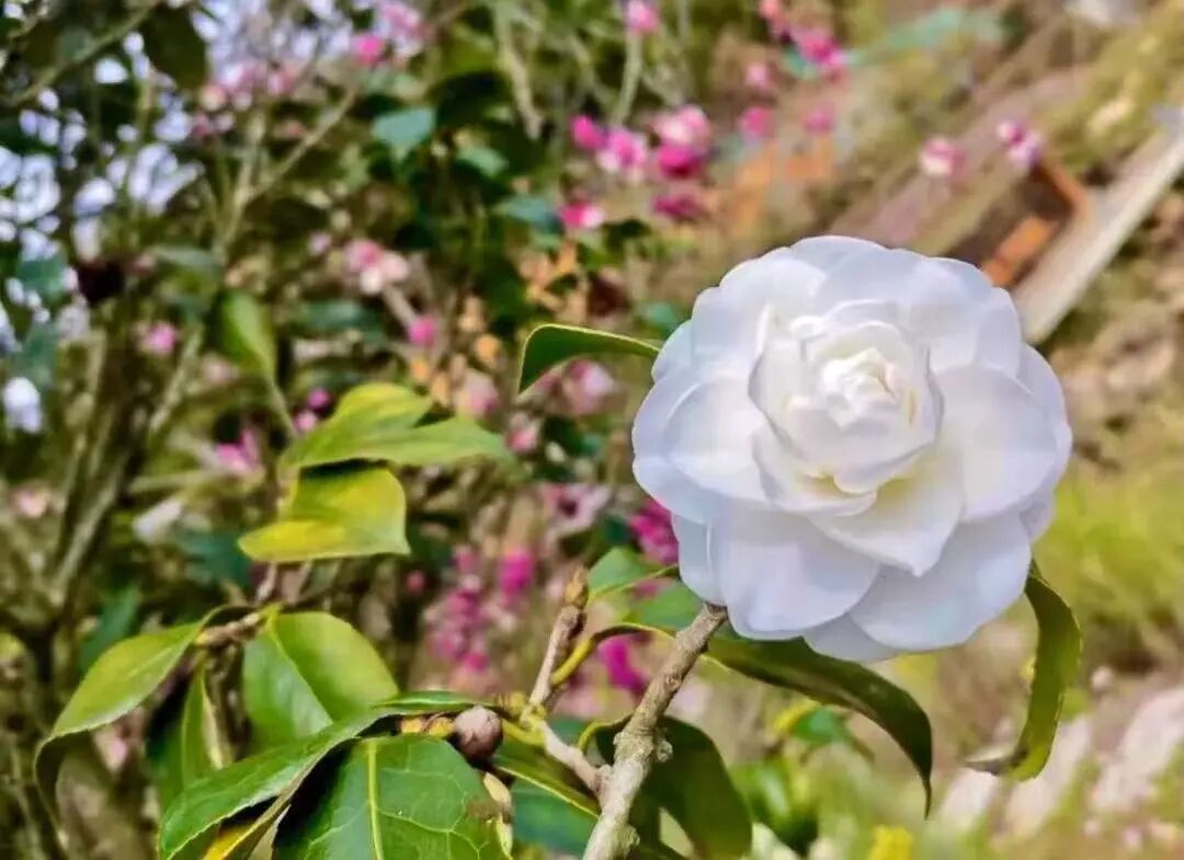 随处可见盛开的茶花、红的、白的、粉的......